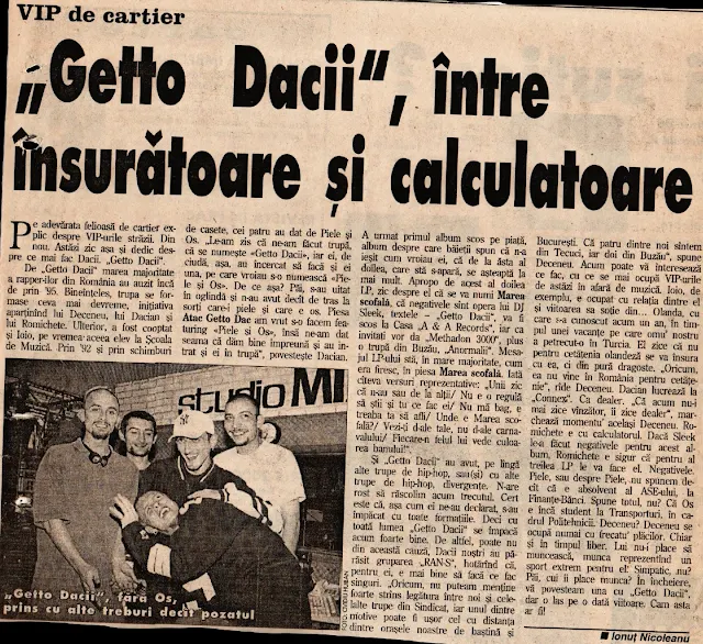 Și "Getto Dacii" au avut, pe lîngă alte trupe de hip-hop, sau(și) cu alte trupe de hip-hop, divergențe. N-are rost să răscolim acum trecutul.Cert este că, așa cum ei ne-au declarat, s-au împăcat cu toate formațiile. Deci cu toată lumea "Getto Dacii" se împacă foarte bine. De altfel, poate nu din această cauză, Dacii noștri au părăsit gruparea "RAN-S", hotărînd că, pentru ei, e mai bine să facă ce fac singuri. "Oricum, nu puteam menține foarte strîns legătura între noi și celelalte trupe din Sindicat, iar unul dintre motive poate fi ușor cel cu distanța dintre orașele noastre de baștină și București. Că patru dintre noi sîntem din Tecuci, iar doi din Buzău", spune Deceneu. Acum poate vă interesează ce fac, cu ce se mai ocupă VIP-urile de astăzi în afară de muzică. Ioio, de exemplu, e ocupat cu relația dintre el și viitoarea sa soție din... Olanda, cu care s-a cunoscut acum un an, în timpul unei vacanțe pe care omu' nostru a petrecut-o în Turcia. El zice că nu pentru cetățenia olandeză se va însura cu ea, ci din pură dragoste. "Oricum, ea nu vine în România pentru cetățenie", rîde Deceneu. Dacian lucrează la "Connex". Ca dealer. "Că acum nu-i mai zice vînzător, îi zice dealer", marchează momentu' același Deceneu. Romichete e cu calculatorul. Dacă Sleek le-a făcut negativele pentru acest album, Romichete e sigur că pentru al treilea LP le va face el. Negativele. Piele, sau despre Piele, nu spunem decît că e absolvent al ASE-ului, la Finanțe-Bănci. Sune totul, nu? Că Os e încă student la Transporturi, în cadrul Politehnicii. Deceneu? Deceneu se ocupă numai cu frecatu' plăcilor. Chiar și în timpul liber. Lui nu-i place să muncească, munca reprezentînd un sport extrem pentru el. Simpatic, nu? Păi, cui îi place munca? În închidere, vă povesteam una cu "Getto Dacii", dar o las pe o dată viitoare. Cam asta ar fi!